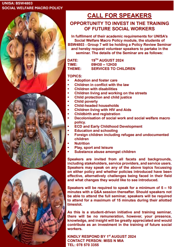 In fulfillment of their academic requirements for UNISA’s Social Welfare Macro Policy module, the students of BSW4803 – Group 7 will be holding an online Policy Review Seminar and hereby request volunteer speakers to partake in the seminar. The details of the Seminar are as follows: